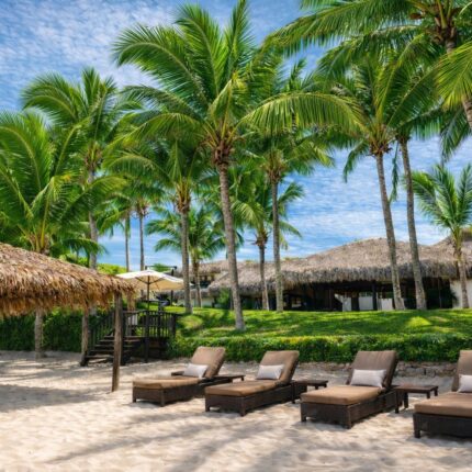 Amplio jardín con palmeras cocoteras